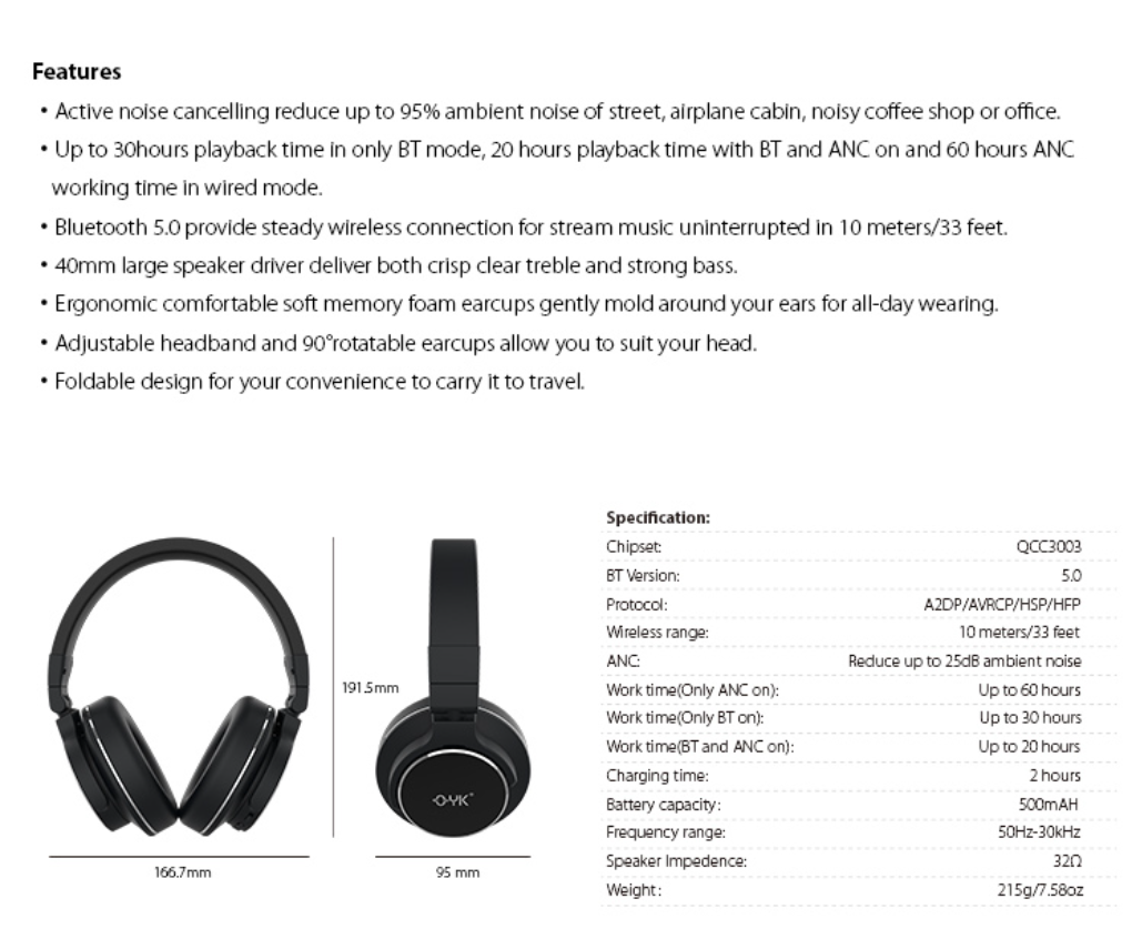 * Accessories: 3.5mm audio cable 1.2m; USB Charging cable 0.9m